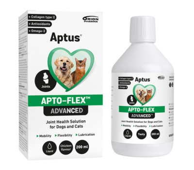 Aptus Apto-Flex Advanced siirup. Täiendsööt koertele ja kassidele. Kanamaitseline lahus. Kõikehõlmav liigese toitainete kompleks liigeste liikuvuse, struktuuri ja paindlikkuse toetamiseks sisaldab olulisi ühendeid tervete liigeste jaoks (kollageen ja II tüüpi kollageen, glükoosamiin, kondroitiin, hüaluroonhape), kalaõli oomega-3-rasvhapetega (EPA ja DHA) ning antioksüdante (E- ja C-vitamiin, mangaan ja MSM).
