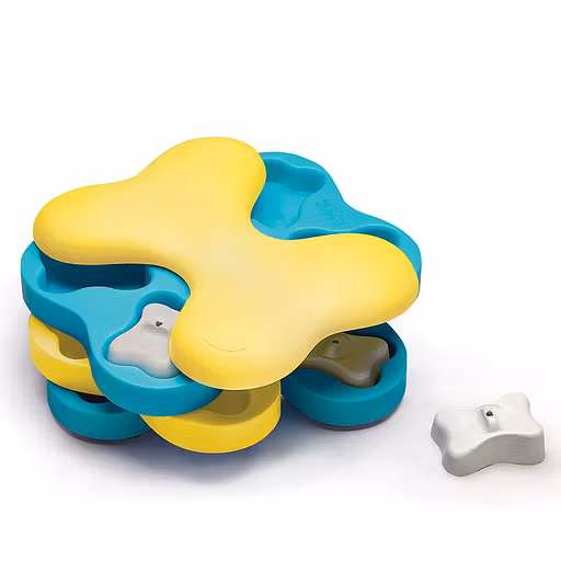 Raskusastme tõstmine –Asetades valge plastmassist klotsi mõnesse õõnsusse kasvatate mängu raskusastet (kaasas kolm klotsi). Klotsi august võib läbi siduda nööri, et lihtsustada klotsi eemaldamist. Juhul kui su koera käpp on vigastatud, võid mängu asetada taburetile, et ta kasutaks ainult oma nina.