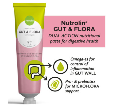 Nutrolin Gut & Flora toitainepasta koertele või kassidele on täiendsööt igapäevaseks kasutuseks. Sisaldab Omega-3 rasvhappeid, mis kaitsevad sooleseina, samal ajal kui probiootikumid ja prebiootikumid toetavad mikrofloorat. Kahekordne toime maksimaalse efekti saavutamiseks. Stabiliseeritud koostis, ei sisalda vett. Maitsev ja lihtsasti manustatav pasta (oleogeel) mugavas pakendis.