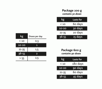 20 kg kaaluva looma päevane annus sisaldab: 1000 mg omega-3 EPA ja DHA, Ühte miljardit elusat probiootilist bakterit (Enterococcus faecium), 50 mg looduslikku E-vitamiini.