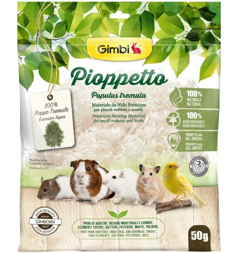 Gimbi Pioppetto kvaliteetne pesamaterjal on 100% looduslik ja biolagunev. Seda toodetakse põhjamaisest puhtast ja värskest haavapuidust (Populus tremula). Pesamaterjal on keskkonnasõbralik, kuna kuivatamisel kasutatakse bioenergiat ja toorainet, mis pärineb vastutustundlikust ja jätkusuutlikust metsamajandamisest.